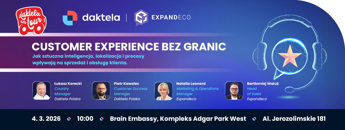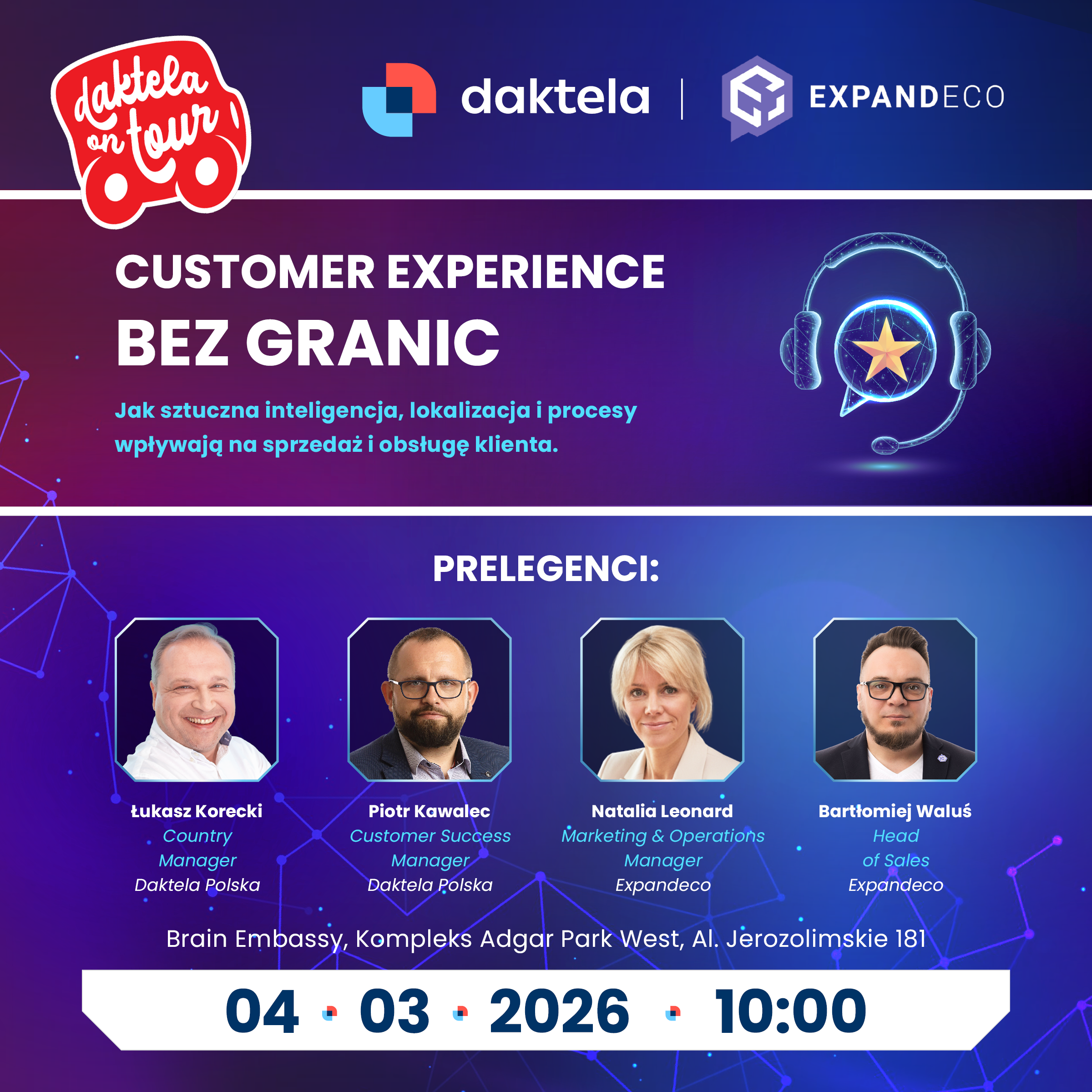 Obsługa klienta to nie tylko technologia, ale i strategia - zobacz, jak Daktela i Expandeco realizują ten cel. Zarejestruj się już dziś i zobacz, jak nowoczesne podejście do Customer Experience wspiera sprzedaż i obsługę klienta.